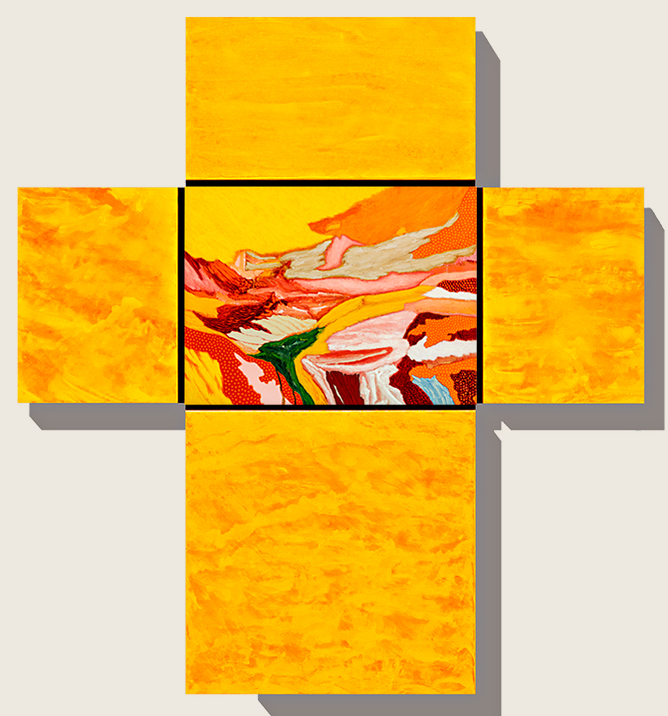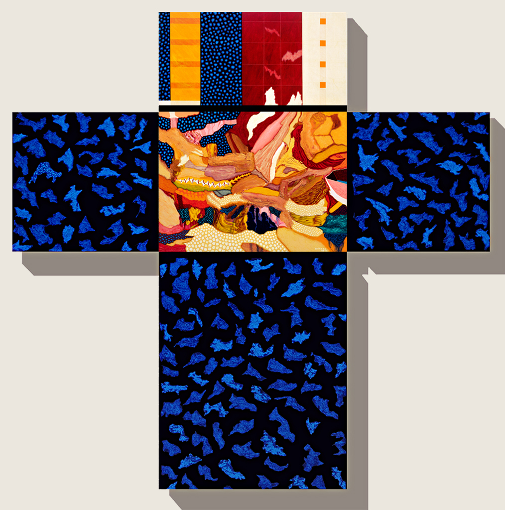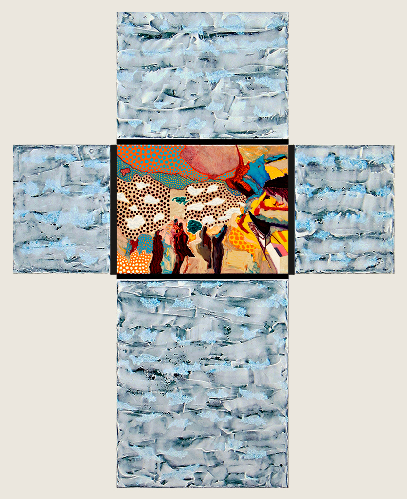 Los Cristos de aire surrealista que Colón había pintado en 2005, llamativamente, han desaparecido del paisaje multicolor. Quedan solos y al descubierto los polípticos cruciformes como huellas abstractas en las que la humanidad y el cosmos se hermanan en un inédito caos de explosión poética. Lejos de clausurar el horizonte, estas huellas prefiguran universos inexplorados que laten a la espera, no de otro manido metarrelato, sino de la mirada develadora de cada espectador en su hazaña intransferible.