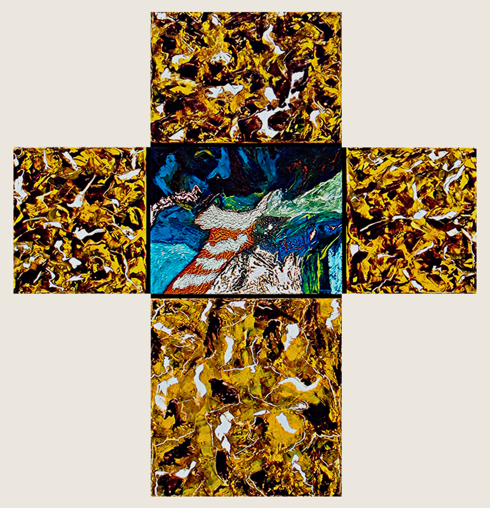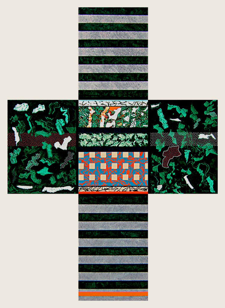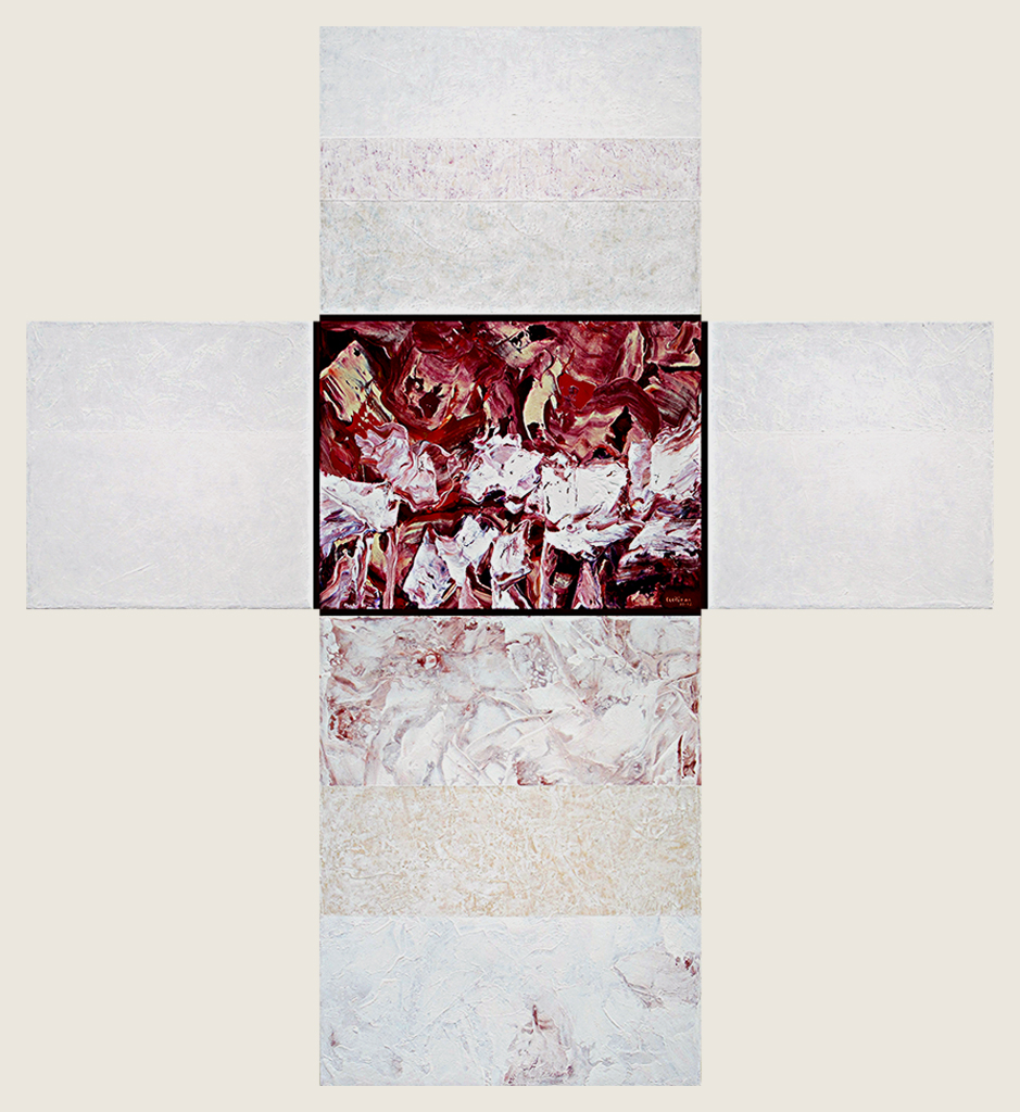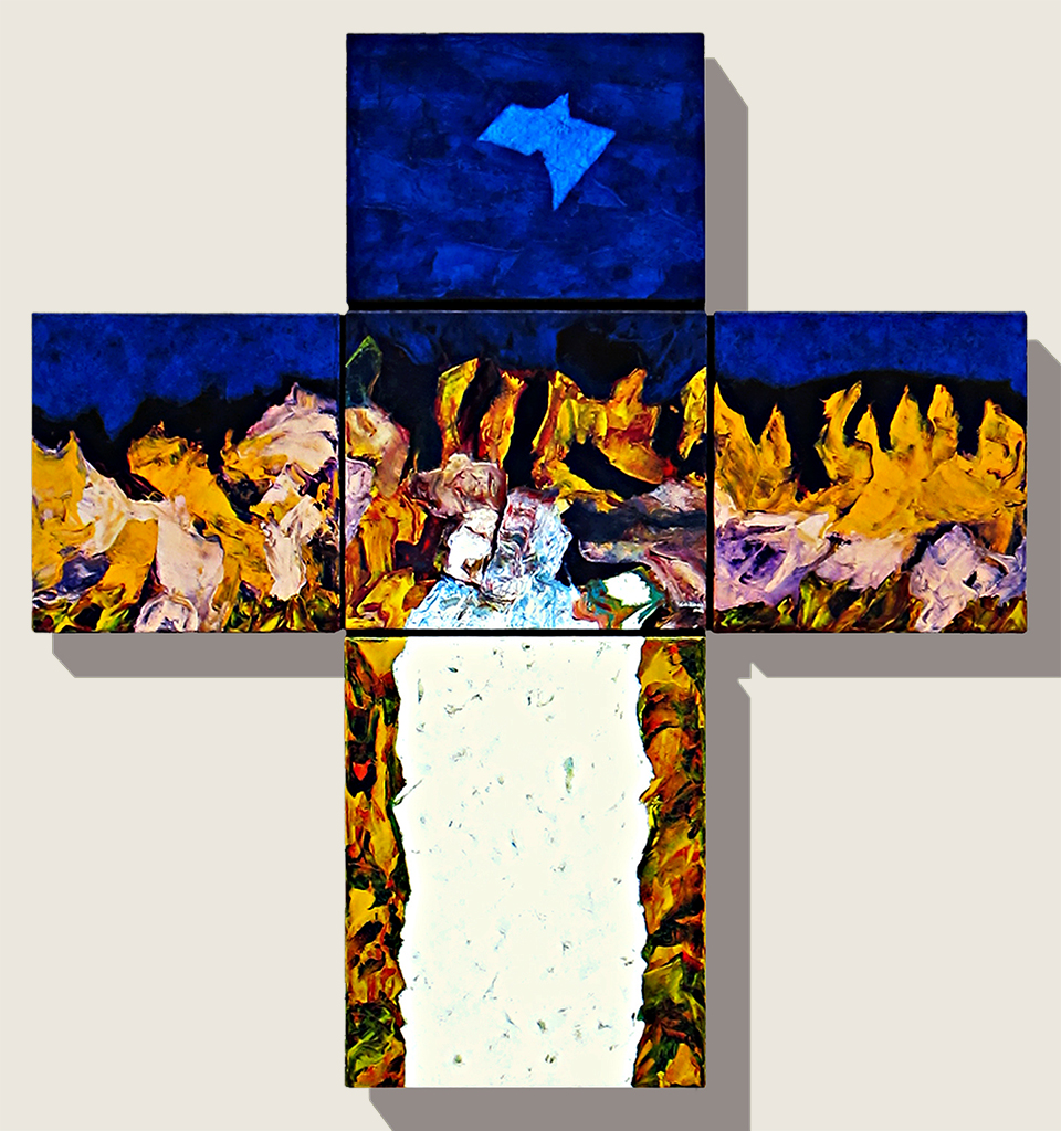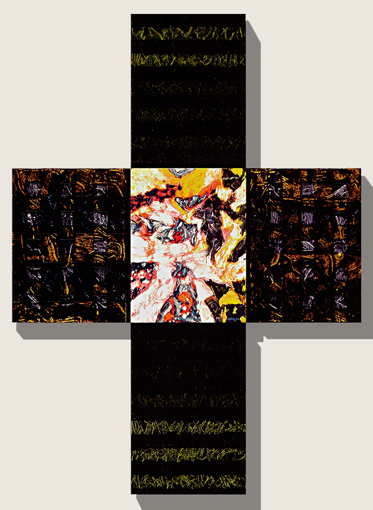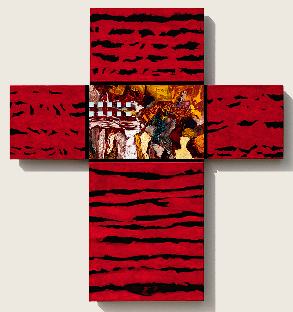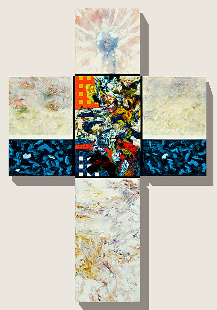 Las catorce obras formadas por múltiples “canvas” ensamblados en forma de cruz, remiten a las exploraciones al mismo símbolo de parte de Joseph Beuys, Antoni Tàpies, Eduardo Chillida o de un Barnett Neumann en sus famosas Estaciones de la cruz: Lema Sabachthani.