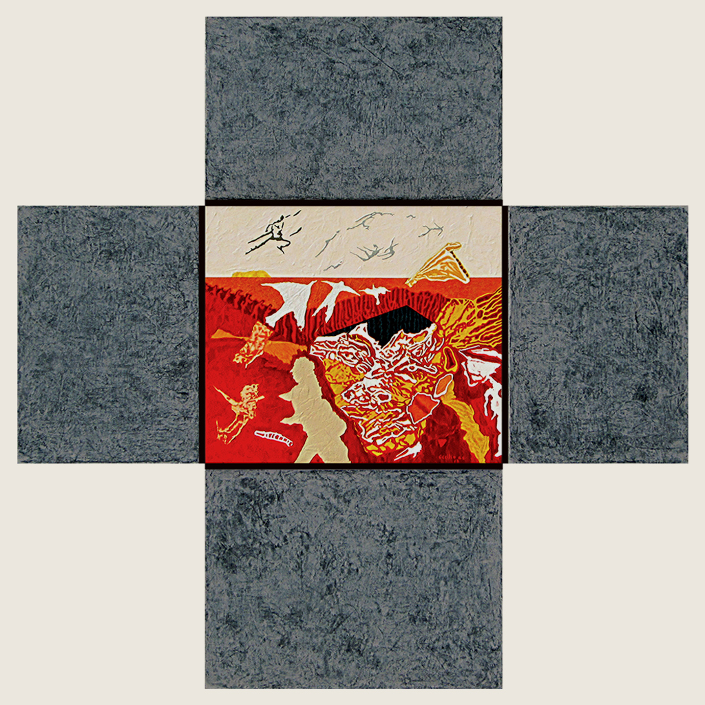 Los Cristos de aire surrealista que Colón había pintado en 2005, llamativamente, han desaparecido del paisaje multicolor. Quedan solos y al descubierto los polípticos cruciformes como huellas abstractas en las que la Humanidad y el cosmos se hermanan en un inédito caos de explosión poética. Lejos de clausurar el horizonte, estas huellas prefiguran universos inexplorados que laten a la espera de la mirada develadora de cada espectador en su hazaña intransferible.