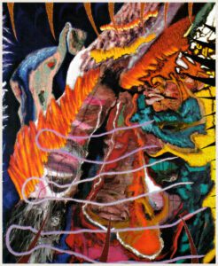 Cecilio Colón Guzmán logra capturar en estos cuadros la venenosa orgía perpetua en que se está viviendo: el constante ultraje a la naturaleza y la destrucción de nuestro ecobalance, la tragedia del SIDA –