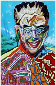 Pero la referencia a su triunfo al conservar su barba y pelo largo, en contra de fuertes presiones que se ejercieron para que los eliminara, como condición de trabajo en la empresa privada, se convierte en un grito de batalla, y de eventual victoria, contra el conformismo y la invasión personal pretendida por la mediocridad institucionalizada de la clase media dominante. Al incluir una rasuradota eléctrica inservible como motivo encontrado, que cuelga cual ahorcado al margen de la pintura, Colón ha añadido un toque de humor negro a la obra. En Sigo pelú y barbú el tono desafiante se robustece al ser el más mimético de los autorretratos, haciendo la autorreferencia inequívoca, pero también pictóricamente seductora por los fuertes contrastes de figuración fantástica y real que se yuxtaponen en las dos mitades de su cara, y el brillante cromatismo de rojos y anaranjados que complementa con sabios toques de verdes tonalidades liláceas. De Sangre nueva-