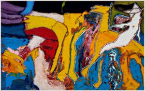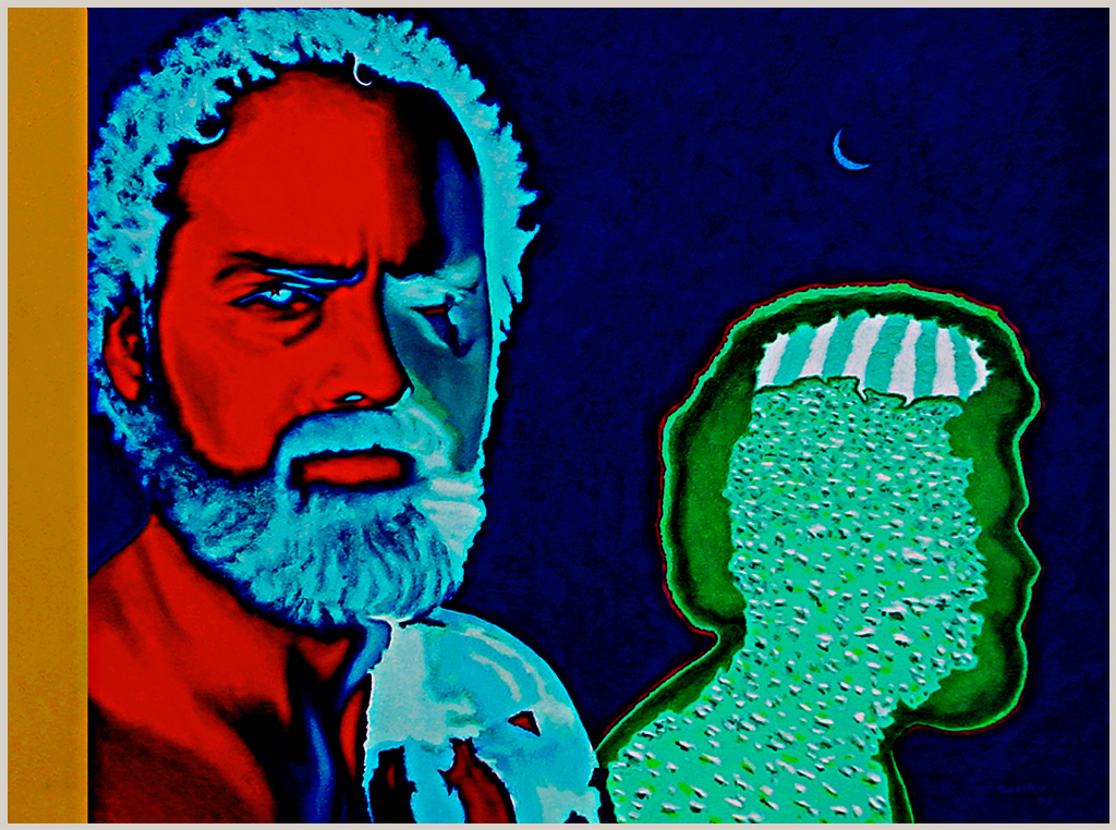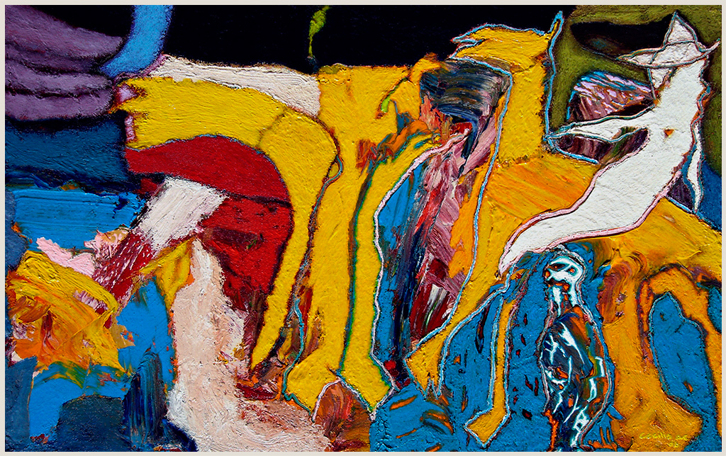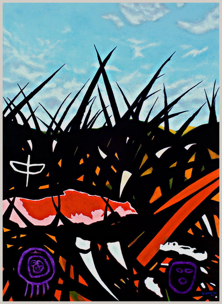 Una de las herramientas de dominación que más están afectando nuestra capacidad de observar con consciencia, es el encuadre conveniente de la imagen televisiva. Sin embargo, hay imágenes queridas que desenmascaran las manipulaciones más sofisticadas. Con un formato parecido al de una pantalla de televisión, pinturas como «El Arresto», «Se lo llevan» o «De dos en dos» entre otras, percibimos todo lo contrario a las imágenes en movimiento que nos presenta ese objeto tan cotidiano. En ellas la emoción y el dolor se agitan. La mentira es desenmascarada y nos graban en la mente personajes extraños. Vemos fantasmas que levitan; águilas en picada; enmascarados y amenazados construyéndose desde un magma plástico que no intenta negar, por apocalíptico que sea el resultado, el placer de la creación. En «Rubito de Vieques», como si fuera un personaje de Shakespeare, el artista ve aparecer inesperadamente al padre muerto. Esta imagen explora la duda que todos debiéramos dejar aflorar en nuestra mente y que es representada en la obra «¿Y acá en el Yunque?». ¿Quién nos explica la epidemia de cáncer y diabetes, entre otras enfermedades que vivimos en la isla grande? El artista norteamericano Ellsworth Kelly intentó emular a Malevich en su camino plástico, logrando magníficas abstracciones, pero su cuadrado negro junto al del ucraniano parece una mala fotocopia. Para los artistas puertorriqueños como Cecilio Colón, la abstracción dista mucho de ser vacía y superficial. Como buen amante de la naturaleza, marino y buzo en la realidad, su práctica plástica refleja metafóricamente esa conversación con las profundidades del agua. Si observamos con cuidado veremos en obras como «Zonas prohibidas», tinglares y manatíes míticos, celajes de ánimas-