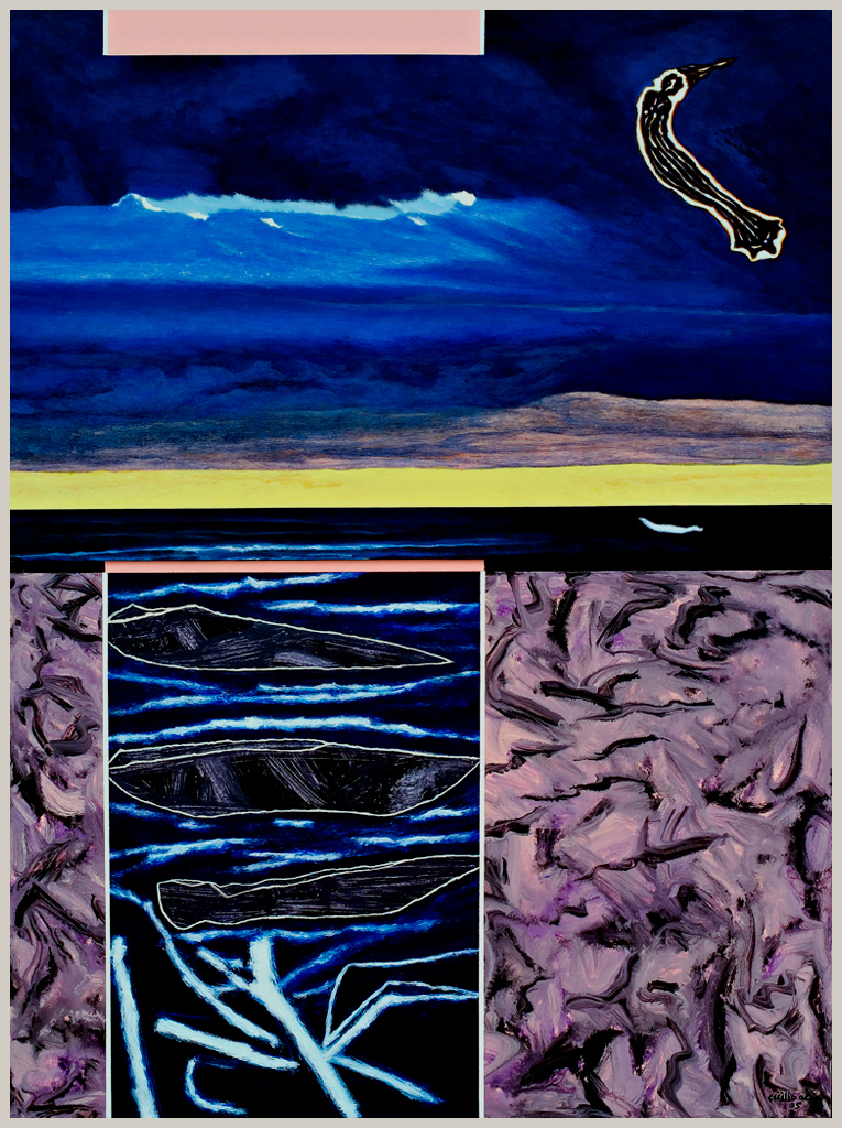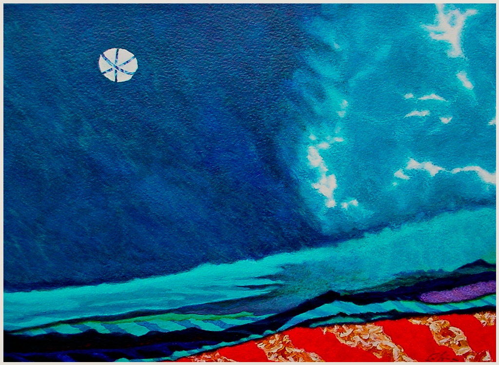 Con el tiempo las abstracciones de Colón se fueron complicando. Sus composiciones se cargaron con los más diversos elementos formales, llegando a un barroquismo dinámico, por momentos caótico y marcado por un frenesí urbano. No obstante, la obra de este pintor se resiste a las etiquetas estilísticas. Su amor por la abstracción no le impidió usar ocasionalmente algún componente figurativo, especialmente en su última exhibición Del Uranio y Otras Sustancias, en la que insertó sus preocupaciones ambientalistas y sociales. Esa tendencia se consolida en su pintura actual, donde la figuración paisajista se manifiesta con la fuerza de la sencillez, pues el estudio del paisaje al natural lo lleva a simplificar sus composiciones. En esta muestra, Cecilio Colón se entrega con decisión a explorar las dramatizaciones propias del realismo. En lugar de seres humanos, sus personajes dramáticos son la ola, el mar, la montaña, las nubes, la luz, la aurora, el ocaso o el amenazante “chaff”. La intensidad teatral de estos paisajes es lograda por la sabia utilización de los altos contrastes y la elegante síntesis de las formas. En Ola Nocturna, una de las mejores piezas de la muestra, una ola blanca irrumpe en un oscuro mar en una noche cargada de misterio y de poesía. Su dibujo es realista y preciso, pero carente de la retórica representativa que lo acercaría a la estampa comercial. Lo mismo sucede en Amanece: un verdadero poema cromático. Aquí, los colores fríos y calientes del cielo, delicadamente sobrepuestos, contrastan con audacia con la silueta violeta, naranja y amarilla de la montaña. En las pinturas tituladas Chaff y Cuidado con las Nubes, reaparece la denuncia ecológica, esta vez representada por nubes de extraño aspecto que cruzan amenazantes por cielos bellamente pintados. Éstas, a su vez, le sirven de vehículo para introducir en el paisaje parte de su vocabulario abstracto. De hecho, hay mucha continuidad entre la pintura anterior y la nueva, sobre todo en la inteligencia de su color y en la simplificación e intercalación de las formas como en un rompecabezas. Aun dentro de su aventura figurativista, este pintor antillano continúa siendo esencialmente abstracto. De esta manera, participa de las últimas tendencias posmodernistas, que permiten al artista apropiarse de diferentes estilos y medios para emplearlos como mejor entienda en su obra artística.